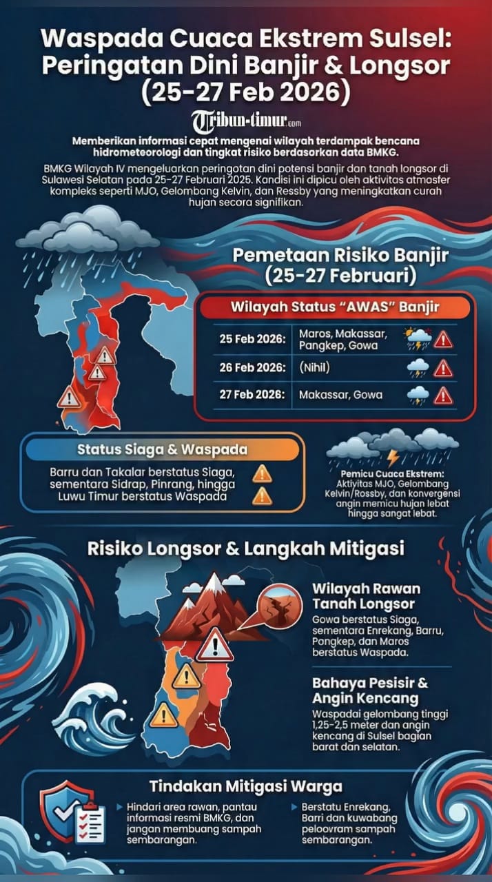 Berdasarkan pemetaan BMKG, sejumlah daerah masuk dalam daftar siaga potensi terdampak, di antaranya wilayah Pesisir Barat: Kota Makassar, Kabupaten Maros, Pangkep, dan Barru. Wilayah Selatan: Kabupaten Gowa, Takalar, hingga Kepulauan Selayar.