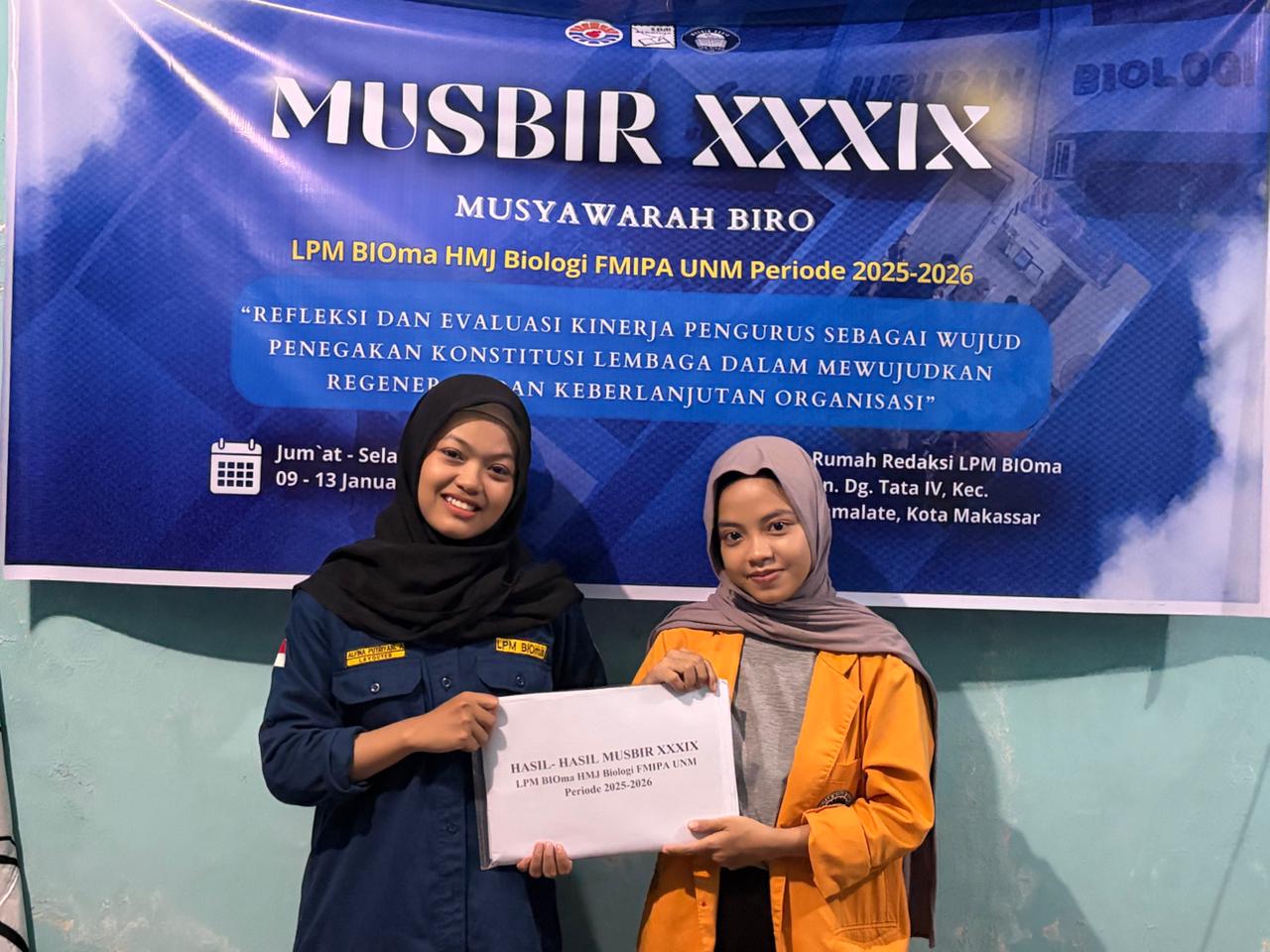 BIOma – Lembaga Pers Mahasiswa (LPM) BIOma HMJ Biologi Fakultas Matematika dan Ilmu Pengetahuan Alam (FMIPA) Universitas Negeri Makassar (UNM) telah melaksanakan Musyawarah Biro (MUSBIR) XXXIX dengan tema “Refleksi dan Evaluasi Kinerja Pengurus sebagai Wujud Penegakan Konstitusi Lembaga dalam Mewujudkan Regenerasi dan Keberlanjutan Organisasi”. Kegiatan ini berlangsung di Rumah Redaksi LPM BIOma, Jl. Dg. Tata 4, Kecamatan Tamalate, pada Jumat-Kamis (09-15/01).